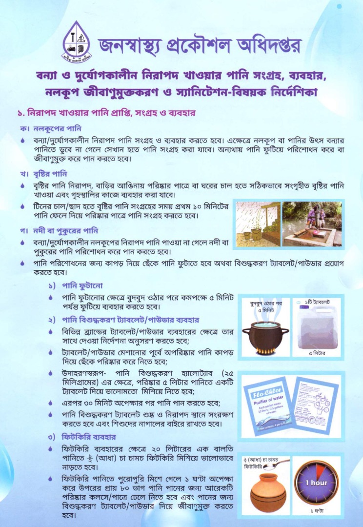 | বন্যা ও দুর্যোগকালীন নিরাপদ খাওয়ার পানি সংগ্রহ,,ব্যবহর, নলকূপ জীবাণুমুক্তকরণ ও স্যানিটেশন-বিষয়ক নির্দেশিকা | ![]() |